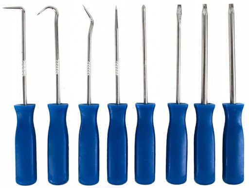 Zestaw 8 śrubokrętów haczykowych. Komplet znajduje zastosowanie głównie przy demontażu oringów i różnego typu uszczelek. Rękojeść z antypoślizgowego materiału zapewnia pewny chwyt.