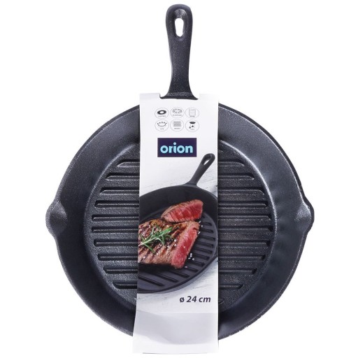 Patelnia grillowa, żeliwna idealna do przygotowywania różnego rodzaju potraw. Możemy użytkować ją w każdej kuchence, ale również bezpośrednio na grillu, czy ogniu. Patelnia jest niezwykle solidna i ciężka. Odpowiednio użytkowana posłuży długie lata. Żeliwo rozgrzewa się równomiernie i długo utrzymuje ciepło, dzięki czemu serwowane dania dłużej będą ciepłe. Sprawdzi się w domu, a także podczas biwaków, wycieczek pod namiot czy innych wyjazdów. Oryginalny produkt czeskiej marki Orion. Wyprodukowano zgodnie z europejskimi standardami.