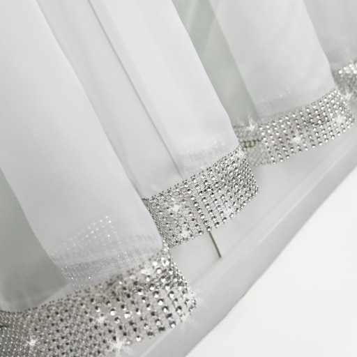 Oferujemy państwu firanę z białego woalu wykończona ozdobną taśmą z cyrkoniami, gotową do zawieszenia.