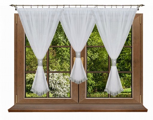 W zestawie z firaną znajduje się tasiemka z cyrkoniami do dekoracyjnego upięcia firany.