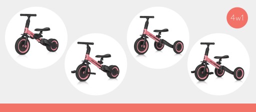 - Wersje rowerka: 4w1, jeździk trójkołowy (od 1 do 2 lat dziecka), rowerek trójkołowy (od 2 do 3 lat), rowerek biegowy (od 3 do 4 lat), rowerek, rower dwukołowy
