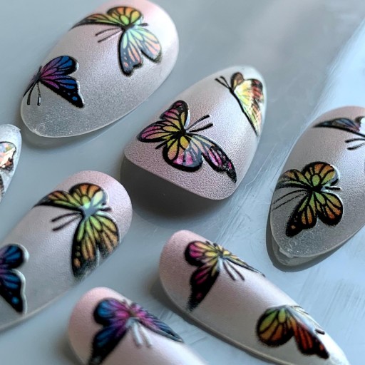 ✔️Wybrany model jest w pięknym błyszczącym kolorze z kolorowymi motylkami 3d. Paznokcie w kształcie migdała.