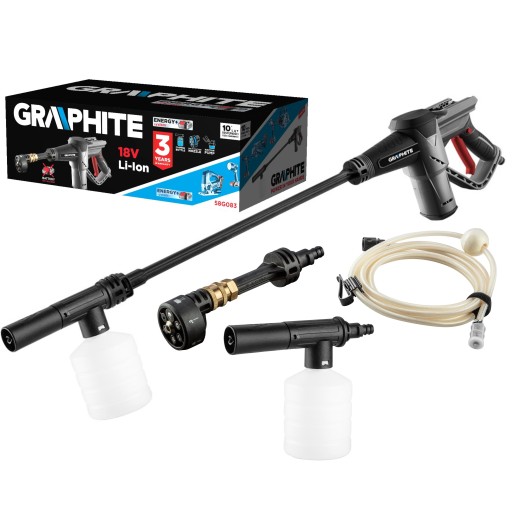 Myjka ciśnieniowa akumulatorowa, 58G083, GRAPHITE to wysokiej jakości urządzenie zasilane akumulatorem Energy+ o mocy 18 V. Produkt wyposażony jest w pompę ssącą, dzięki czemu niewymagany jest dostęp do stałej instalacji wodnej. Myjka ma dwa poziomy przepływu, a dysza posiada 6 regulowanych rodzajów strumieni, co pozwala na dostosowanie parametrów pracy do charakteru mytej powierzchni np. mebli tarasowych czy roweru. Do urządzenia dołączona jest również pianownica, wytwarzająca piane, dzięki której można poradzić sobie nawet z najbardziej uporczywym brudem.