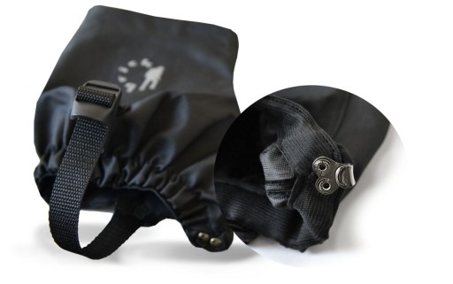 - Góra ochraniacza posiada elastyczną linkę z klipsem regulującym jego długość, dzięki czemu można szczelnie docisnąć materiał na nodze.