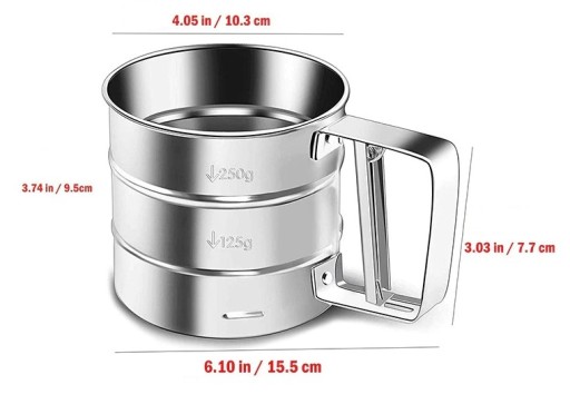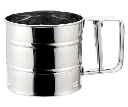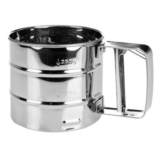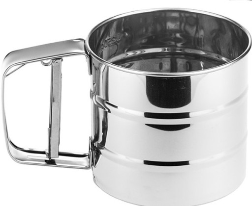 Sitko z rączką do przesiewania mąki wykonane ze stali nierdzewnej.