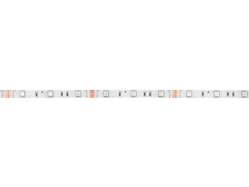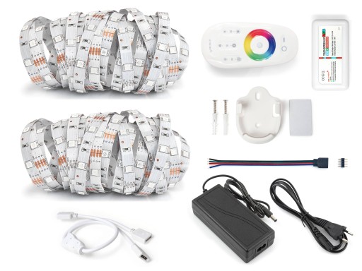 1. Taśma LED RGB (x2) o długości 5m zakończonej szybko złączką. Źródłem światła jest chip SMD5050, który zbudowany jest z trzech segmentów R-czerwony, G-zielony, B-niebieski (3w1). W wyniku regulacji natężenia każdego z tych segmentów można uzyskać pożądaną barwę światła. Taśma zbudowana jest na solidnym podkładzie PCB i pracuje pod napięciem 12V. Produkt można ciąć co ok. 10cm dzięki czemu można go dostosować według potrzeby do danego miejsca montażu. Na jej lewej stronie znajduje się taśma dwustronna.