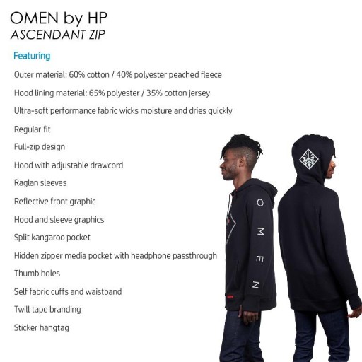 Wygoda techniczna to główna zaleta bluzy z kapturem OMEN Ascendant — wykonanej z miękkiego materiału odprowadzającego wilgoć, z otworami na kciuki i ukrytą kieszenią na multimedia z przepustem na słuchawki.