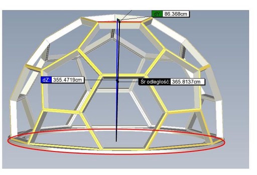 Średnica kopuły xx,x m, grubość ścian ***** mm, wysokość **** m. Charakterystyka transportowa: waga konstruktora 0,8 tony, kubatura 1,5,60 m3.