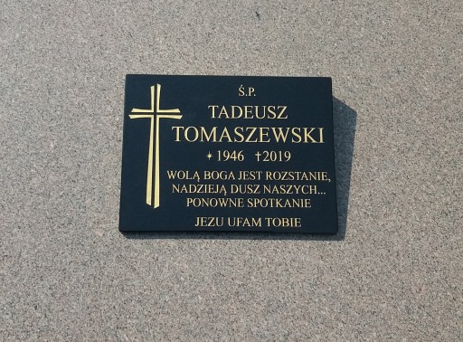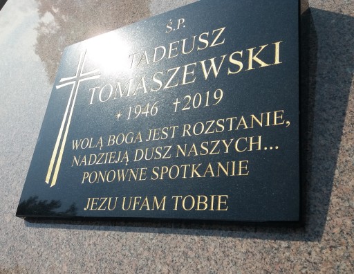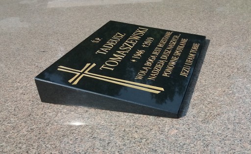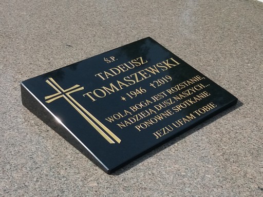 Oferujemy tablice w różnych rozmiarach wykonane z polerowanego czarnego granit. Przy wykonywaniu naszych tablic nagrobkowych dbamy o najdrobniejsze szczegóły, które ustalamy wspólnie z zamawiającym. Pełna kolorystyka, krój i wielkość czcionki, a także dodatkowe elementy ozdobne modyfikujemy na poziomie projektu i oddajemy Klientowi do zatwierdzenia, dzięki temu wersja finalna w pełni odpowiada jego oczekiwaniom. Do produkcji używamy najwyższej jakości materiałów, aby tablice przetrwały w niezmienionym wyglądzie długie lata. Nasze wieloletnie doświadczenie pozwala nam świadczyć najlepsze usługi. Istnieje możliwość bezpiecznej wysyłki tablicy przez firmę kurierską. Kolor liter - złoty srebrny lub biały wykonujemy na zamowienie klienta.