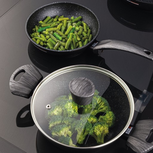 Ponadto, pełno powierzchniowa indukcja daje możliwość używania naczynia na palniku o dowolnej średnicy – od najmniejszego do największego. Patelnia została wykonana z najwyższej jakości aluminium odpornego na obtłuczenia i inne uszkodzenia. Wewnątrz pokryta powłoką nieprzywierającą, która umożliwia smażenie w minimalnej ilości tłuszczu. Całość uzupełnia solidny uchwyt typu Soft Touch, który zapewnia mocny chwyt i bezpieczne przenoszenie naczynia. Rączka nie nagrzewa się w trakcie użytkowania.
