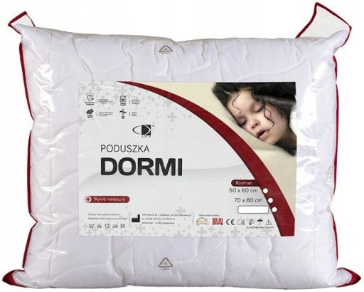 Poduszka Dormi to wyrób antyalergiczny. Wypełniona jest specjalnymi kulkami poliestrowymi Amball, które dzięki swojej sprężystości i miękkości idealnie dopasowują się do kształtu oraz ułożenia głowy. Produkt ten stanowi zatem wygodne oparcie dla odcinka szyjnego kręgosłupa.