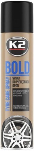 K2 Bold to szybki i łatwy w użyciu środek przeznaczony do nabłyszczania i konserwacji opon. Przywraca oryginalny wygląd, nadaje lśniący połysk i głęboką czerń. Chroni przed promieniami UV, pękaniem oraz matowieniem. Dzięki właściwością hydrofobowym ogranicza osadzanie się zabrudzeń. Może być używany również do nabłyszczania i konserwacji innych powierzchni gumowych oraz plastikowych.