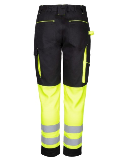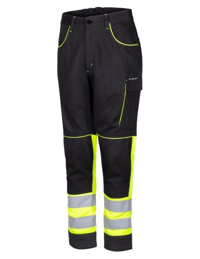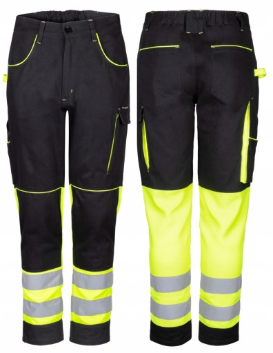 - Spodnie robocze-ochronne w kolorze czarnym niebrudzącym wraz z estetycznymi żółtymi-seledynowymi wstawkami w kieszeniach przestrzennych