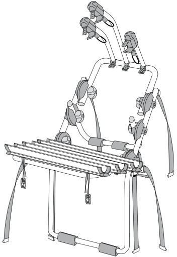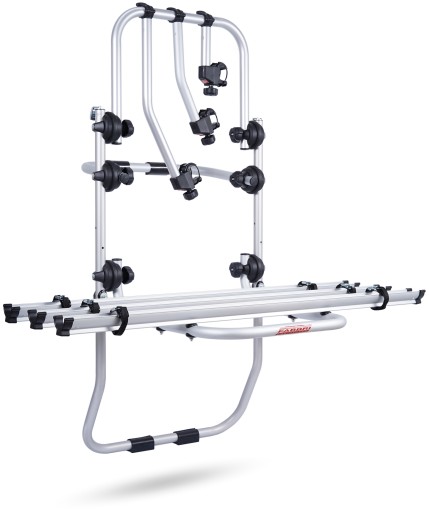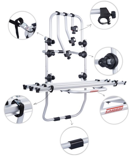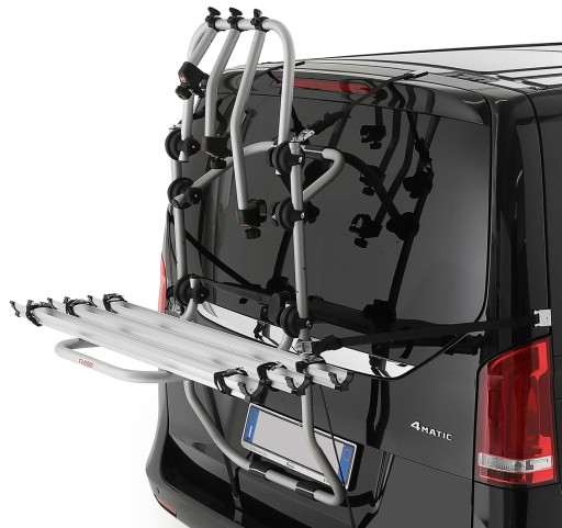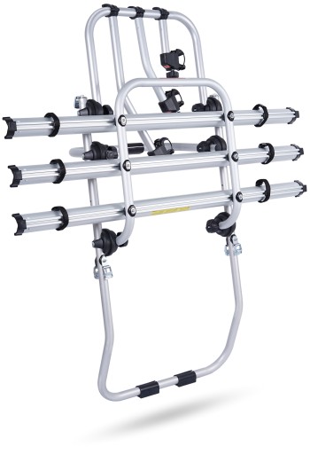 Składany, aluminiowy, włoski uchwyt do przewozu 3 rowerów, montowany na tylnej klapie bagażnika samochodowego za pomocą 6 pasów. Zastosowane płozy pozwalają przewozić rowery o maksymalnym rozstawie osi do 117 cm. Lekki i solidny, wstępnie zmontowany i łatwy do zainstalowania na tylnej klapie. Postaw na sprawdzone rozwiązanie.