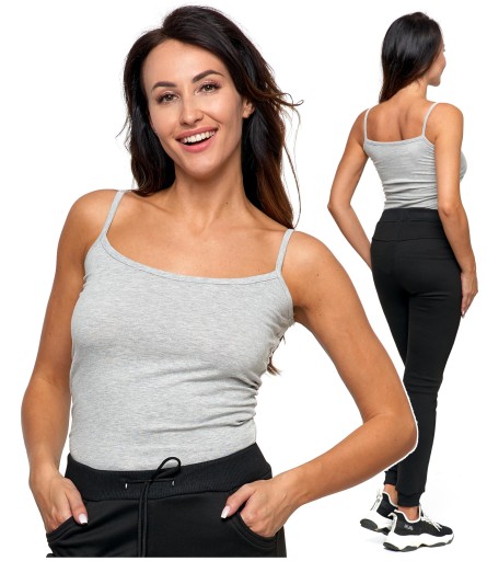Wygodna, gładka podkoszulka damska na wąskich naramkach. Wykonana z wysokiej jakości bawełny z dodatkiem domieszki elastanu, który odpowiada za odpowiednie dopasowanie oraz sprawia, że bluzka posłuży Ci przez wiele sezonów.
