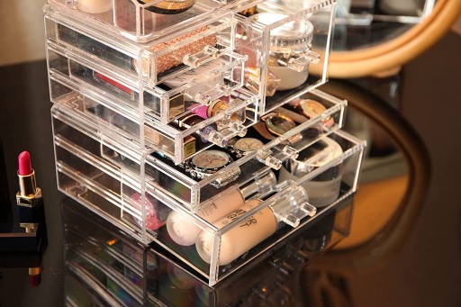 Elegancki organizer na kosmetyki wykonany z akrylu. Wykonany z trzech oddzielnych elementów które można rozłączyć.