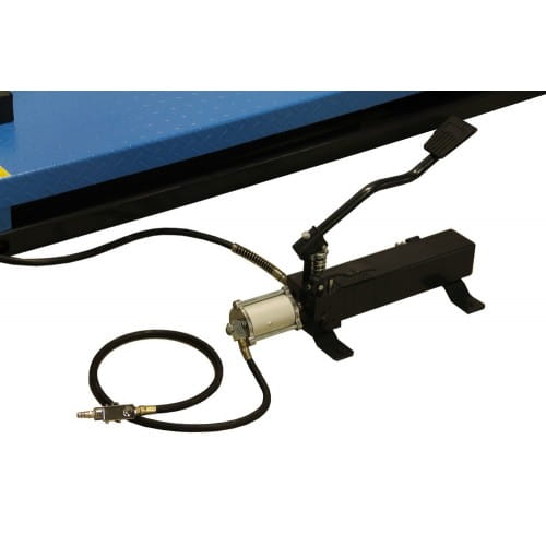 Podnośnik krzyżakowy z pompą hydrauliczną sterowaną pneumatycznie. Maty gumowe zabezpieczają przed uszkodzeniami lakieru. Łatwy do przestawiania dzięki parze kółek skrętnych.