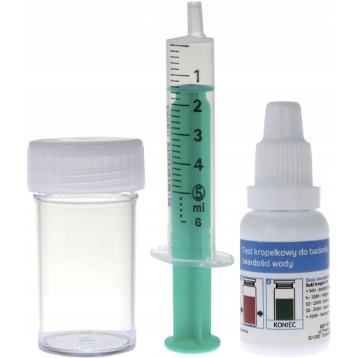 ✴️ Wewnątrz opakowania TEST-u-T jest zbiorniczek ze specjalnym płynem, strzykawka oraz pojemnik na wodę. Aby wykonać test, należy odmierzyć strzykawką 5 ml wody i zakroplić nią płyn.