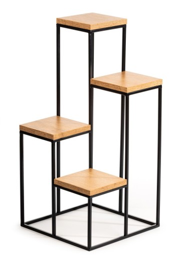 Nowoczesny kwietnik stojący w stylu loftowym. Dzięki swojej prostocie i unikalnemu designowi stojak będzie idealny jako uzupełnienie do każdego stylu mieszkania, pokoju czy domu. Dzięki solidnemu i wytrzymałemu wykonaniu sprawdzi się również na: balkon, ogród, altanę czy werandę. Stojak wykonany jest z drutu stalowego oraz z solidnej płyty MDF w kolorze dąb lancelot. Kwietnik jest trwały, lekki i stabilny dzięki czemu ma uniwersalne zastosowanie w domu czy ogrodzie. Kwietnik ma cztery poziomy wysokości : 70 cm, 52 cm, 36 cm oraz 21 cm. Prezentowany kwietnik jest w kolorze czarnym z blatem w kolorze dąb lancelot. Wymiary: Wysokość : 70/52/36/21 cm Szerokość 34 cm Głębokość: 34 cm Rozmiar blatu: 17x17 cm.