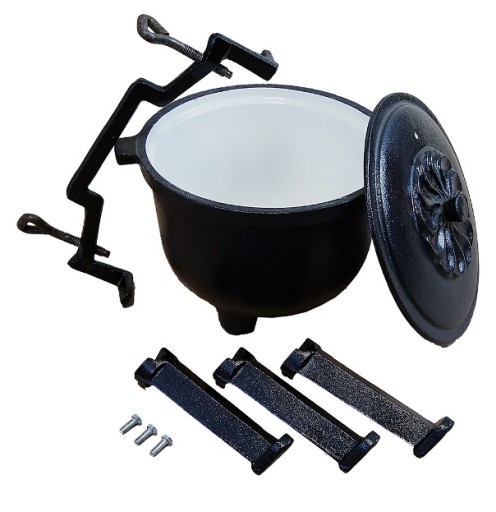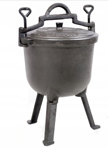 Kociołek Wykonany z najwyższej jakości stopu żeliwa odpornego na najwyższe temperatury. Firma ta jako pierwsza zastosowała specjalny odpowietrznik w pokrywie, który reguluje ciśnienie wewnątrz kociołka, przez co jest on w 100% bezpieczny. Kociołek może stać bezpośrednio w ognisku, a dzięki poręcznemu uchwytowi może być zawieszony również nad ogniskiem. Produkt posiada również odkręcane nóżki, przez co kociołek można umieścić w kominku lub bezpośrednio w palenisku. Dzięki wytłoczeniu na pokrywie masz pewność, że kupujesz oryginalny i bezpieczny produkt.