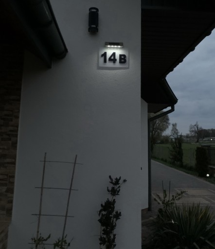 Tabliczka zaopatrzona jest w moduł z baterią słoneczną, więc jest ładnie podświetlona w nocy diodami LED i nie wymaga zasilania przez kabel.