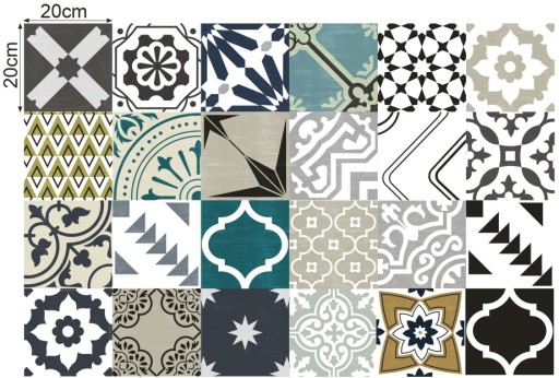 Oto dostępne zestawy, każdy z nich składa się z 25 pojedynczych naklejek (każdy kwadracik w zestawie stanowi oddzielna naklejke 20x20cm, tak jak na rysunku obok) pozwala to na dowolną aranżacje całości. Na pozostałych naszych aukcjach dostępne są te same wzory w innych rozmiarach. Po zakupie proszę o informacje który z nich ma zostać wysłany.