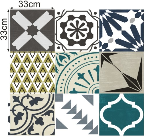 Oto dostępne zestawy, każdy z nich składa się z 9 pojedynczych naklejek (każdy kwadracik w zestawie stanowi oddzielna naklejke 33x33cm, tak jak na rysunku obok) pozwala to na dowolną aranżacje całości. Na pozostałych naszych aukcjach dostępne są te same wzory w innych rozmiarach. Po zakupie proszę o informacje który z nich ma zostać wysłany.