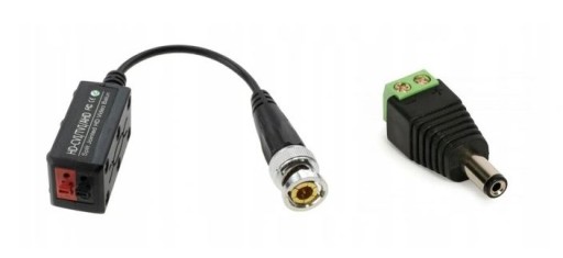 Do połączania przewodu z rejestratorem, kamerą i zasilaczem otrzymują Państwo komplet wtyków i konwerterów BNC na skrętkę:
