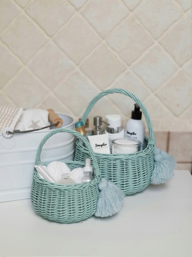 Koszyczek w całości wykonany ręcznie z najwyższej jakości wikliny, pochodzącej z polskich gospodarstw. Pomalowany jest na kolor miętowy specjalną ekologiczną farbą, która jest bardzo odporna na uszkodzenia. Nasze farby posiadają atest PZH i można nimi malować zabawki i meble dziecięce.
