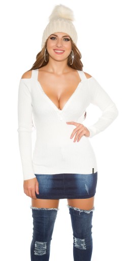 Elegancki sweter ozdobiony z przodu zameczkiem z cyrkoniami. Ramiona odsłonięte. Materiał elastyczny, prążkowany.