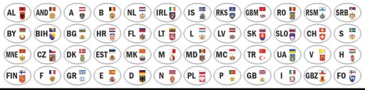 Kraje: Albania (AL), Andora (AND), Austria (A), Belgia (B), Białoruś (BY), Bośnia i Hercegowina (BIH), Bułgaria (BG), Chorwacja (HR), Czarnogóra (MNE), Czechy (CZ), Dania (DK), Estonia (EST), Finlandia (FIN), Francja (FIN), Gibraltar (GBZ), Grecja (GR), Hiszpania (E), Holandia (NL), Irlandia (IRL), Islandia (IS), Kosowo (RKS), Liechtenstein (FL), Litwa (LT), Luksemburg (L), Łotwa (LV), Macedonia (MK), Malta (M), Mołdawia (MD), Monako (MC), Niemcy (D), Norwegia (N), Polska (PL), Portugalia (P), Rumunia (RO), San Marino (RSM), Serbia (SRB), Słowacja (SK), Słowenia (SLO), Szwajcaria (CH), Szwecja (S), Turcja (TR), Ukraina (UA), Watykan (V), Węgry (H), Wielka Brytania (GB), Włochy (I), Wyspa Man (GBM), Wyspy Owcze (FO)