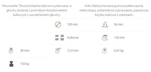 Elastyczna szara GUMOWA pełna opona, niebrudząca, poliamidowa czarna piasta, pojedyncze łożysko kulkowe z osłonkami. Jakość toczenia koła znakomita. Opona amortyzuje nierówności.