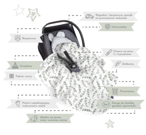 - Kocyk ma uniwersalny rozmiar - dopasowuje się do kształtu fotelika