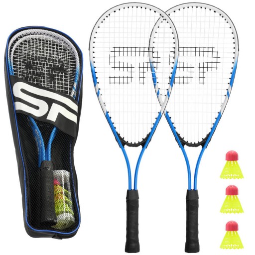 - składa się z dwóch aluminiowych rakiet z mocnym naciągiem przeznaczonym do szybkiej gry, 3 lotek oraz pokrowca z uchwytem na ramię,