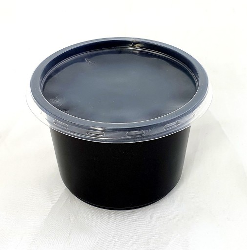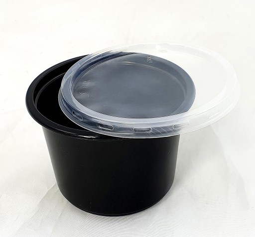 Kubek do zgrzewu o średnicy 11,5 cm 0.5 l w kolorze czarnym z pokrywką wykonany z tworzywa PP idealnie nadaje się do gorących dań. Pokrywkę można stosować na założoną folię lub bez foli . Pokrywka utrzymuje dłużej ciepło potrawy niż tylko sama folia po zdjęciu której nie ma czym przykryć kubka . Pojemnik można podgrzewać w mikrofalówce.