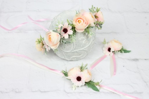 W ofercie mamy również do kompletu wianek na głowę oraz przypinkę do butonierki.