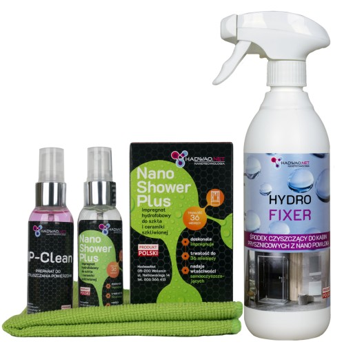 - 1 x 50 ml - powłoka hydrofobowa "Nano Shower Plus" służąca zabezpieczeniu szkła w kabinie prysznicowej