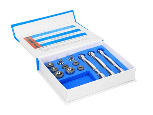 W zestawie znajduje się dziewięć głowic różnej wielkości z chirurgicznej nierdzewnej stali szlachetnej, pokrytych kryształkami diamentu o czterech rodzajach ziarnistości 100,150,180, 200.