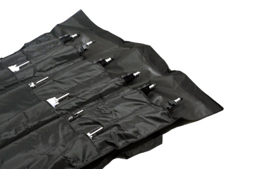 Futerał umożliwia w bezpieczny sposób przenieść najpotrzebniejsze elementy studia. Podzielony jest na 12 niezależnych komór, mieszczących lekkie statywy fotograficzny (np. model 803 z naszej oferty) oraz parasolki.