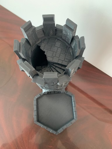 Dicetower wykonana z plastiku PLA, składa się z 4 części.