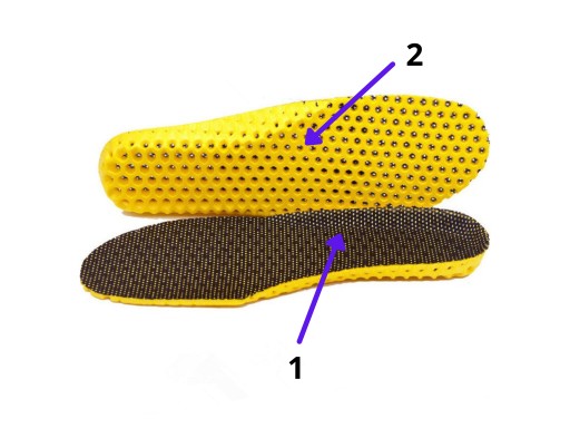 - 2. Zewnętrzna strona wkładki - pokryta jest pianką, dzięki czemu wkładka łatwo dopasowuje się do każdego typu obuwia. We wkładce znajdują się dziurki, które odprowadzają pot.