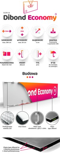 Kasetony świetlne z dibondu z serii ECONOMY zostały przez nas zaprojektowane z myślą o Klientach, którzy chcą otrzymać produkt wysokiej jakości za niewielką cenę. Moduły LED służące jako oświetlenie zostały rozmieszczone wzdłuż dłuższych krawędzi, dzięki temu grubość kasetonu to zaledwie 5cm. Maksymalne wymiary to 290x50cm.