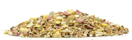 Skład: ekstrudaty kukurydziane, płatki kukurydziane, sorgo japońskie, pszenica, płatki pszenne, nasiona słonecznika, rozdrobniona pszenica, płatki grochu, kukurydza, chleb świętojański, proso czerwone, marchewka, nasiona kanaru, gryka, żółte proso, owsiane poduszki, drób, wołowina, mięta pieprzowa, owies, krewetki, fasola złota, ryby.