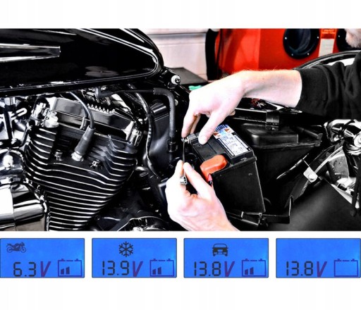 - Bezpieczeństwo – szereg zabezpieczeń chroni zarówno samą ładowarkę jak i akumulator oraz instalację elektryczną motocykla lub innego pojazdu