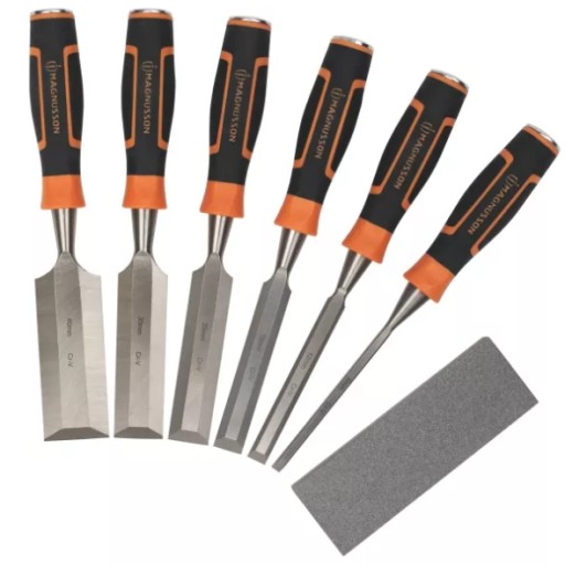 - Zawartość zestawu: 7-częściowy zestaw Magnusson zawiera dłuta 6 mm, 12 mm, 20 mm, 25 mm, 30 mm i 40 mm oraz osełkę olejową w walizce
