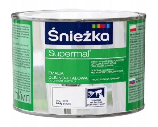 Supermal® Emalia Olejno-Ftalowa BIAŁA 0,4L -BIAŁY POŁYSK Emalia olejno-ftalowa do drewna i metalu RAL 9003