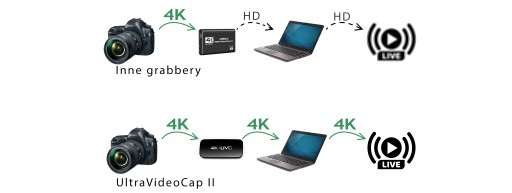 UltraVideoCap II umożliwia nagrywanie oraz transmisję w rozdzielczości 4K. Przesyła do komputera nieskompresowany obraz w najwyższej, profesjonalnej jakości (bezstratne formaty YUY2, NV12 oraz pełne RGB bez podpróbkowania chrominancji) wraz z towarzyszącym mu dźwiękiem.