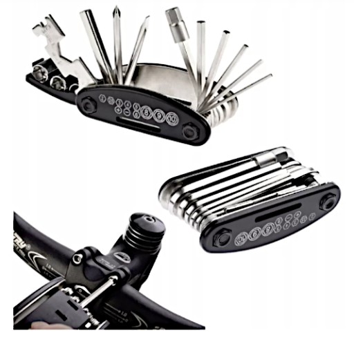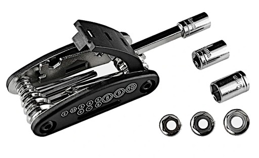 Komplet zawiera 16 najważniejszych narzędzi służących do regulacji roweru. Całość została zamknięta w kompaktowej formie scyzoryka.