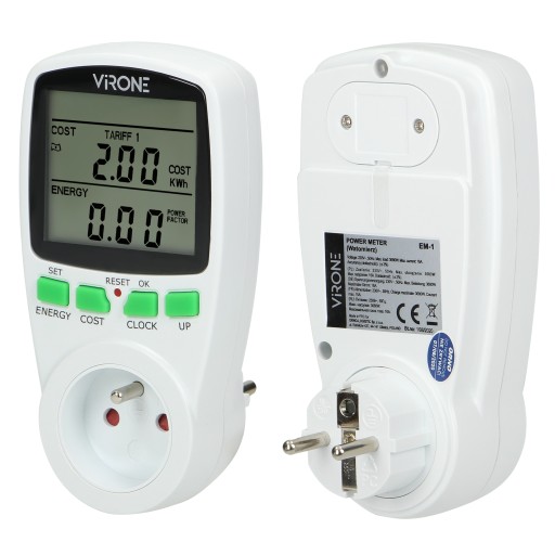 Watomierz umożliwia nam sprawdzenie zużycia prądu elektrycznego i obliczenie kosztów zużytej energii podłączonego urządzenia (2 oddzielne taryfy do obliczenia kosztów.). Duży wyświetlacz LCD pokazuje dodatkowo aktualny czas, napięcie i natężenie prądu, współczynnik mocy, częstotliwość, maksymalne obciążenie prądu i ostrzeżenie o przeciążeniu, możliwość wprowadzenia 4 rodzajów waluty. Wewnętrzny akumulator: 2 × 1,5V LR44 podtrzymuje ustawienia urządzenia w razie braku prądu.
