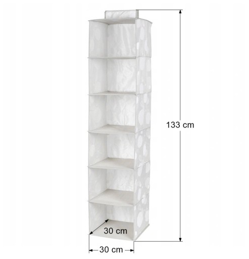 Organizer posiada 6 półek dzięki czemu łatwością będzie można posegregować ubrania. Pionowa konstrukcji mocowana do rurki minimalizuje miejsce które zajmuje w szafie pozwalając by każda rzecz zyska swoje odpowiednie miejsce